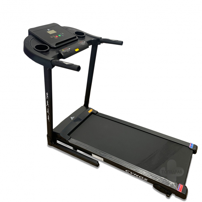 CYNOS — электрическая беговая дорожка чёрного цвета для домашнего применения и использования в спортивных и реабилитационных целях. Модель отличается присутствием в комплектации специальных удлинённых поручней для реабилитационных занятий, возможностью регулировки наклона бегового полотна в трёх положениях. Универсальное применение Эта модель беговой дорожки универсальна. Может использоваться для частных тренировок в домашних условиях при различных нагрузках. Входящие в комплект поручни превращают её в эффективный тренажёр для реабилитации после перенесённых заболеваний и операций на опорно-двигательном аппарате. Для обоих случаев предусмотрены подходящие программы тренировок. Удобство занятий Для максимального комфорта во время тренировок предусмотрены подставка для планшета, две ниши для стаканов или бутылки с водой. На поручнях расположены кнопки регулировки скорости, а также датчики пульса. Имеется 12 встроенных программ тренировок, а также возможность вручную отрегулировать угол наклона в 3-х положениях. Дорожка развивает скорость до 12 километров в час. Шаг изменения скорости беговой дорожки 0,1 км/ч. Предназначена для людей, чей вес не превышает 120 кг. Компактное хранение Беговая дорожка CYNOS имеет складную конструкцию. В сложенном виде она занимает минимум места, что удобно для небольших квартир. Есть два варианта хранения: с поручнями или без них. Первый подходит, если нужно регулярное использование дорожки. Во втором случае поручни снимаются для более длительного и компактного хранения (например, в кладовой). Транспортировочные ролики позволяют легко перемещать её при необходимости.